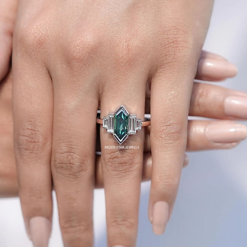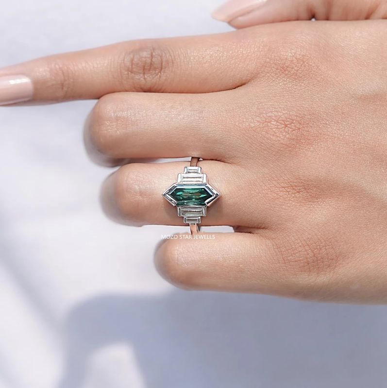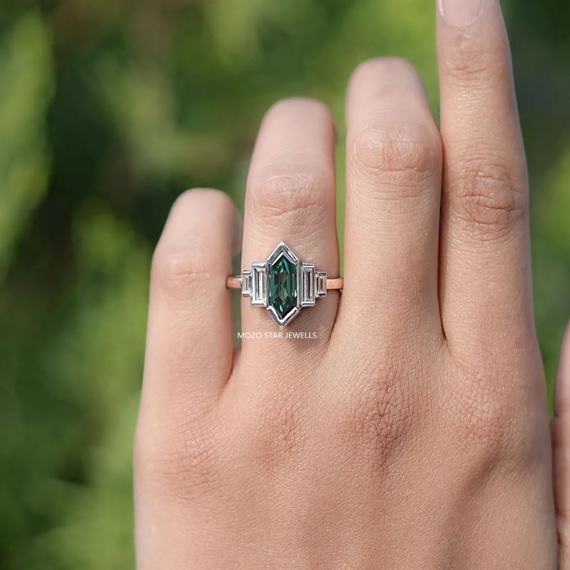 Green Elongated Hexagon Cut Moissanite Ring, Half Bezel Moissanite Engagement Ring, Five Stone Moissanite Bridal Ring, Perfect Gift For Her, 935 Argentium Silver Moissanite Wedding Ring, Bridesmaid Gift, Elevate Your Elegance With Moissanite by MOZO STAR JEWELLS.
