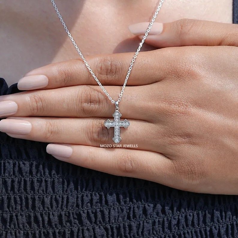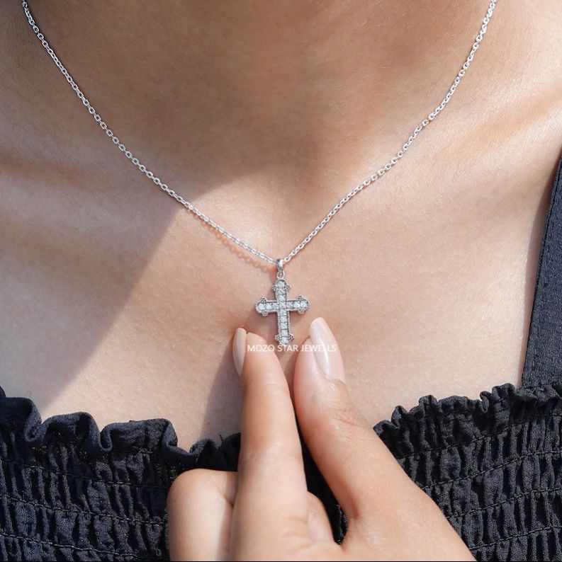 Round Cut Moissanite Wedding Necklace, Colorless Moissanite Necklace, Cross Moissanite Bridal Necklace, 10K White Gold Moissanite Necklace, Birthday Gift For Her, Elevate Your Elegance With Moissanite by MOZO STAR JEWELLS.