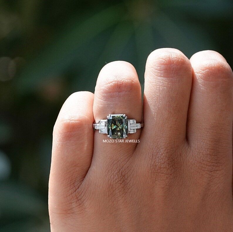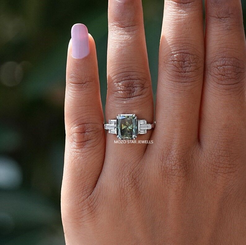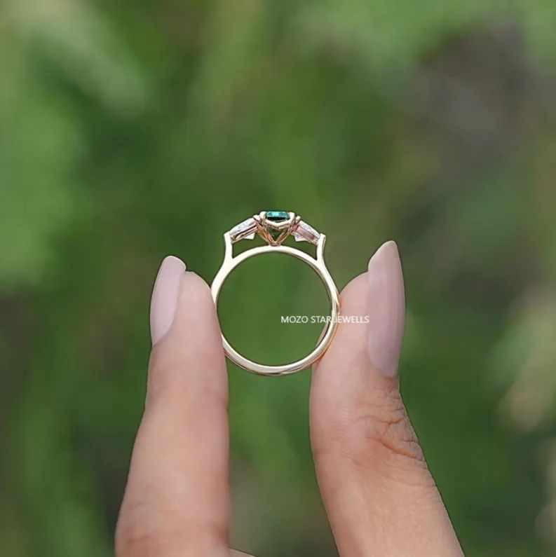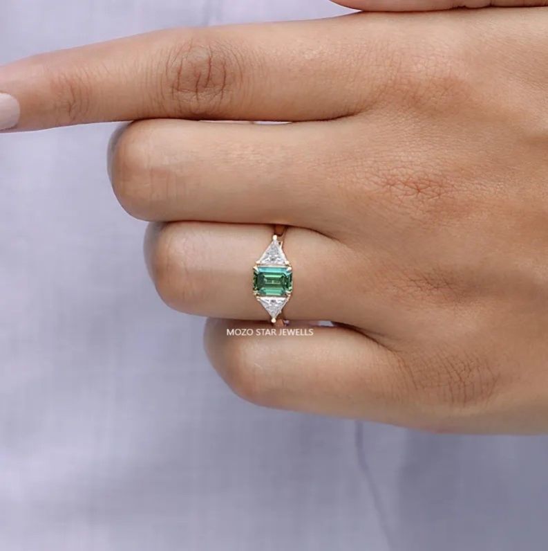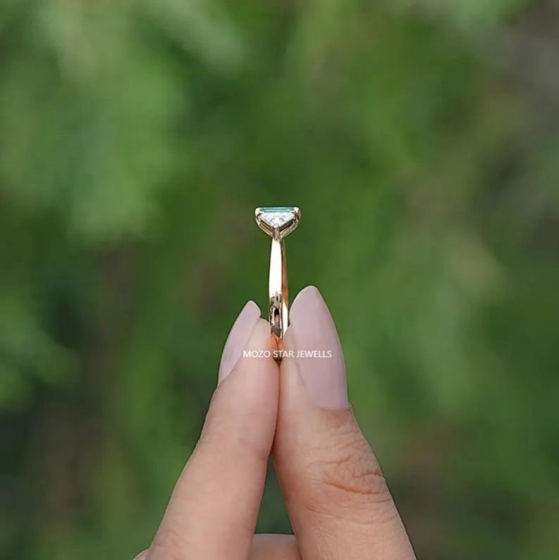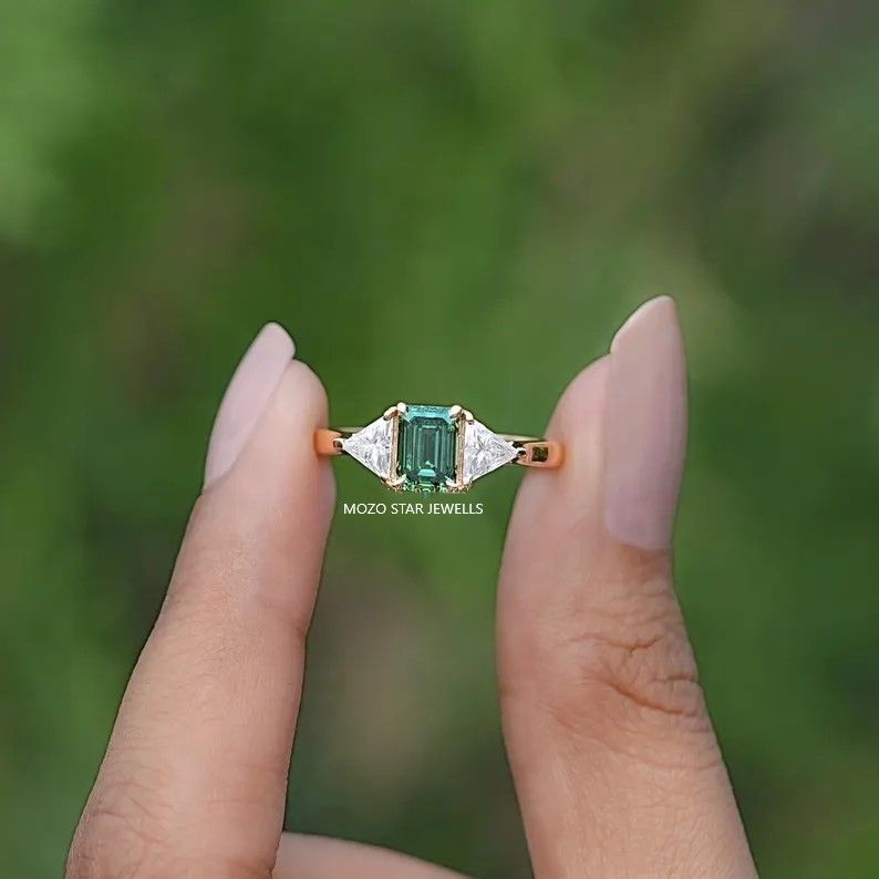 Emerald Cut Moissanite Three Stone Ring, Green Moissanite Engagement Ring, Prong Set Moissanite Wedding Ring, Anniversary Gift For Wife, 18K Yellow Gold Moissanite Bridal Ring, Three Stone Moissanite Proposal Ring, Side Stone Triangle Moissanite Ring, Gift For Her , Elevate Your Elegance With Moissanite by MOZO STAR JEWELLS.