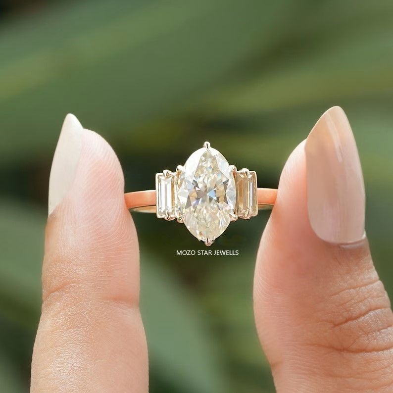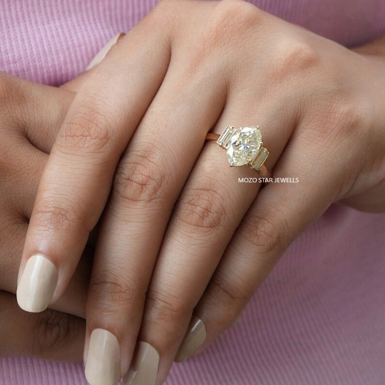 Oval Cut Moissanite Engagement Ring, Off-White Moissanite Proposal Ring, Baguette Moissanite Bridal Ring, 14K Yellow Gold Ring For Her, Three Stone Moissanite Engagement Ring, Birthday Gift For Her, Elevate Your Elegance with Moissanite by MOZO STAR JEWELLS.
