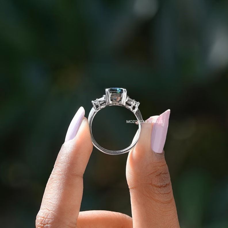 Elongated Cushion Moissanite Ring , Blue Moissanite Wedding Ring , Three Stone Moissanite Engagement Ring , 14K Solid Yellow Gold Moissanite Proposal Ring , Accent Set Moissanite Anniversary Ring , Channel Set Moissanite Ring For Her, Elevate Your Elegance With Moissanite by MOZO STAR JEWELLS.