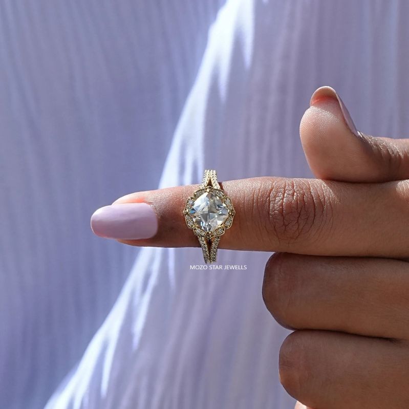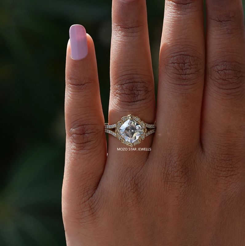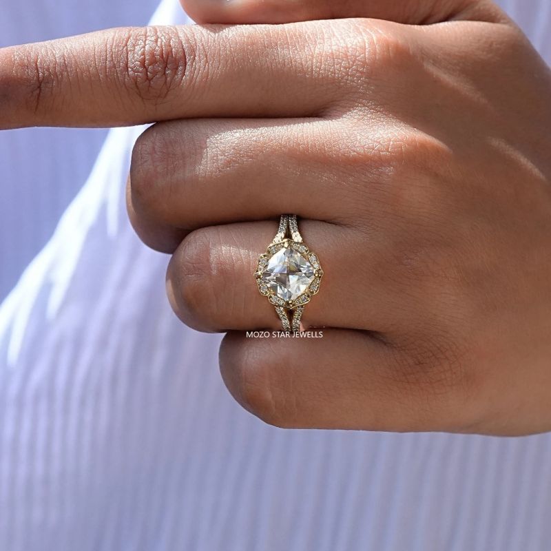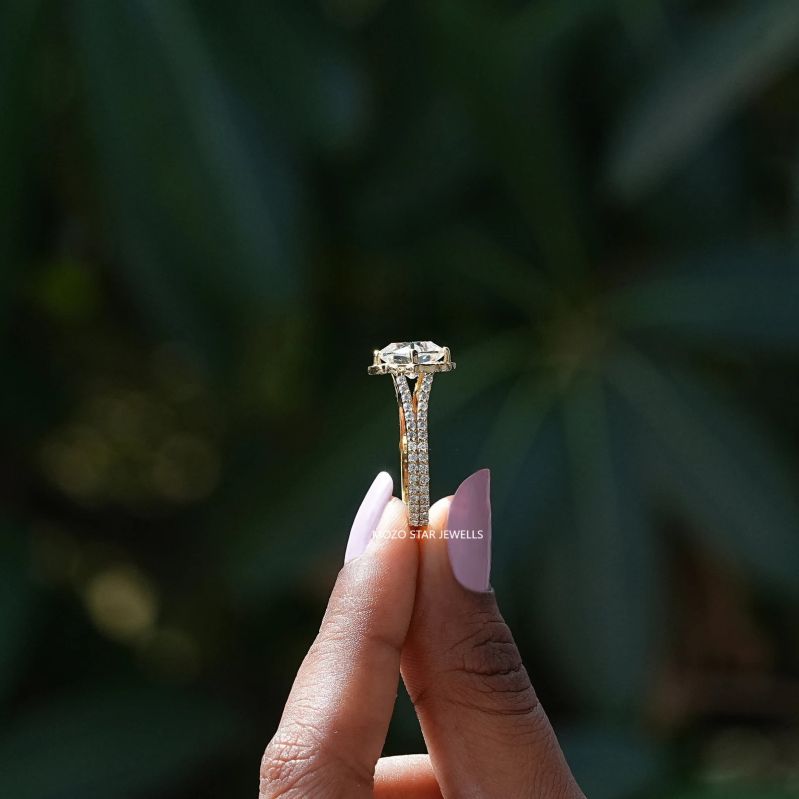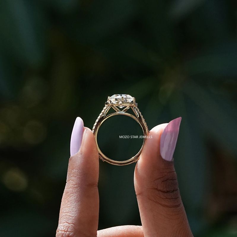 Peruzzi Cut Moissanite Bridal Ring , Colorless Moissanite Wedding Ring , Halo Moissanite Engagement Ring , Split Shank Moissanite Proposal Ring , 14K Solid Yellow Gold Moissanite Anniversary Ring , Round Moissanite Birthday Ring , Accent Set Moissanite Ring Gift For Her, Elevate Your Elegance With Moissanite by MOZO STAR JEWELLS.