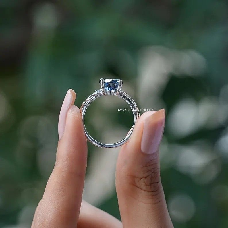 Solitaire Moissanite Proposal Ring , Portuguese Round Moissanite Bridal Ring , Sapphire Blue Moissanite Wedding Ring , Leaf Moissanite Engagement Ring , 14K Solid White Gold Moissanite Bridesmaid Ring , Four Prong Set Moissanite Anniversary Ring , Claw Prong Set Moissanite Ring Birthday Gift For Her, Elevate Your Elegance With Moissanite by MOZ STAR JEWELLS.