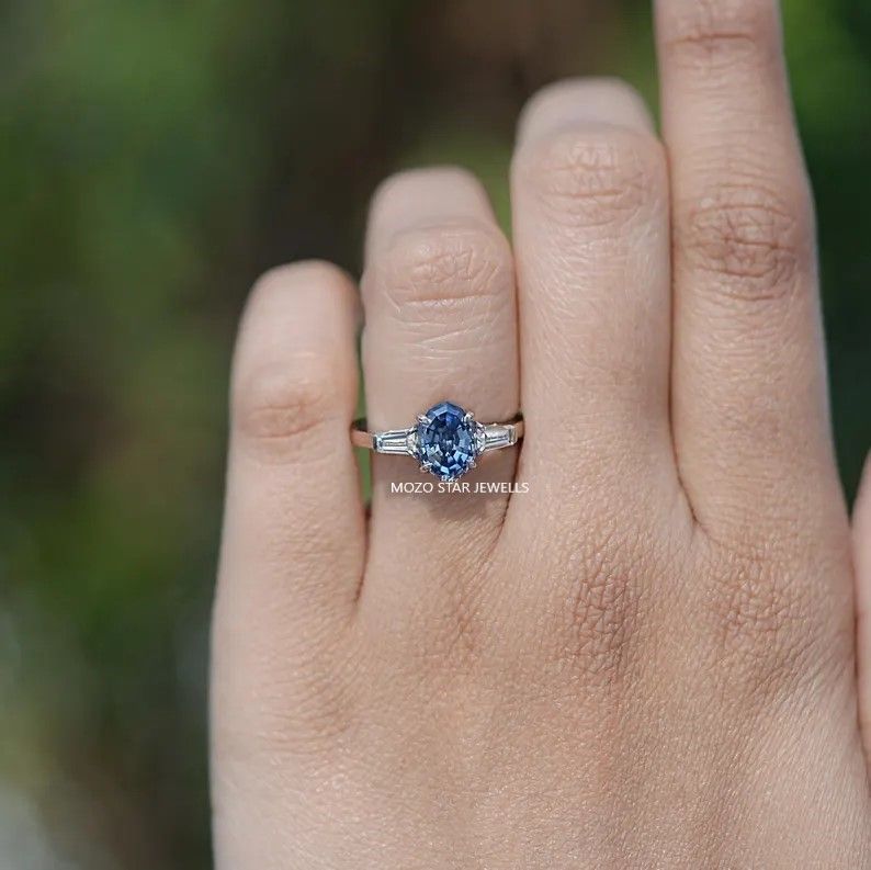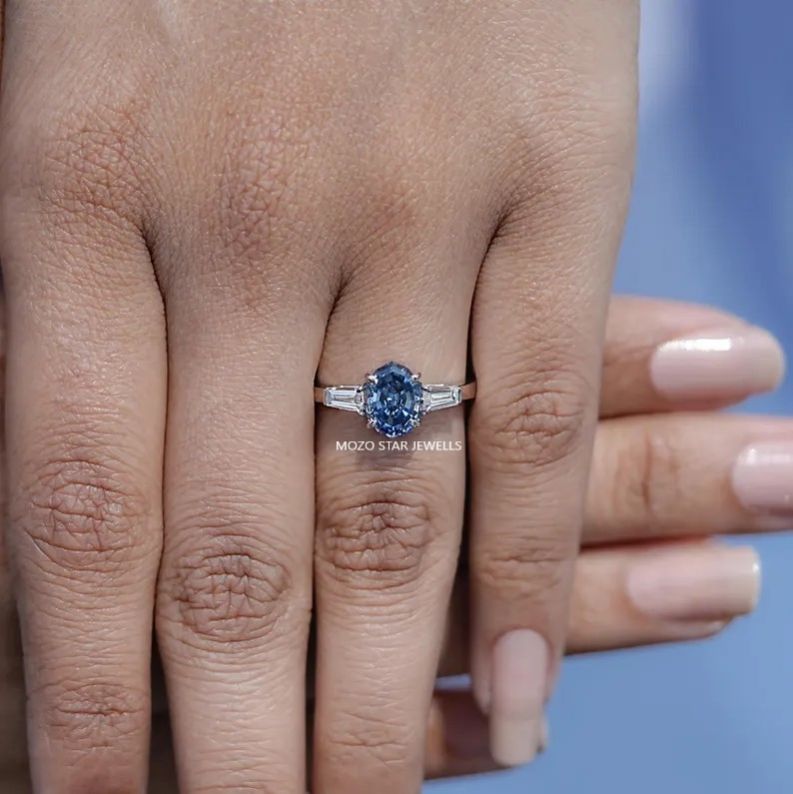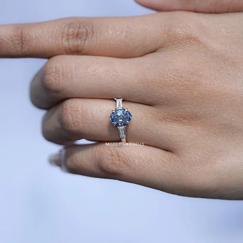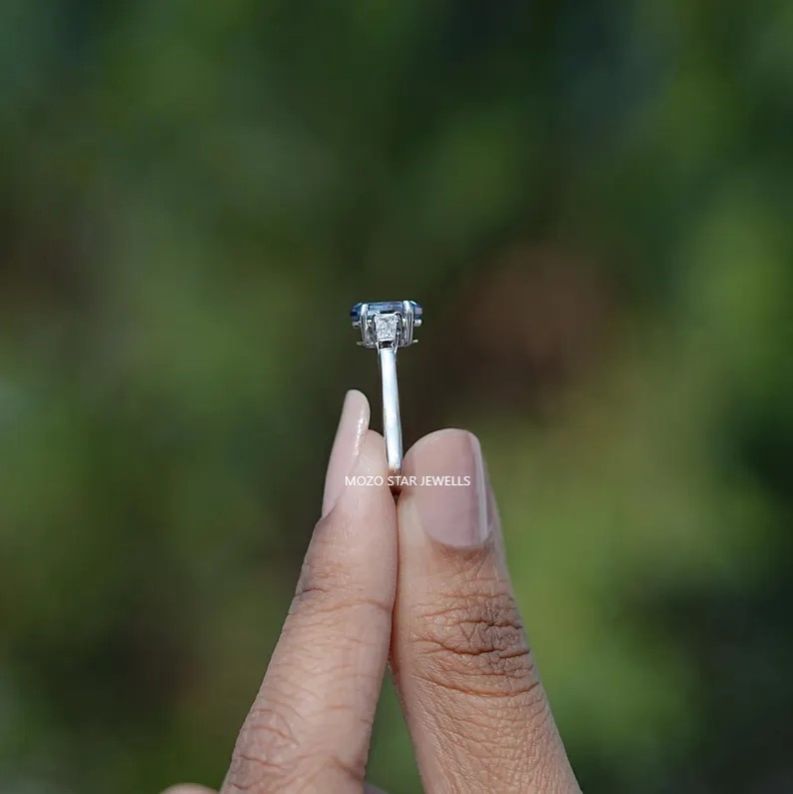 Blue Step Cut Oval Moissanite Wedding Ring, Three Stone Moissanite Bridal Ring, Side Stone Tapered Baguette Moissanite Ring, Bridesmaid Gift, Moissanite Ring For Women, Graduation Gift, Elevate Your Elegance with Moissanite by MOZO STAR JEWELLS.