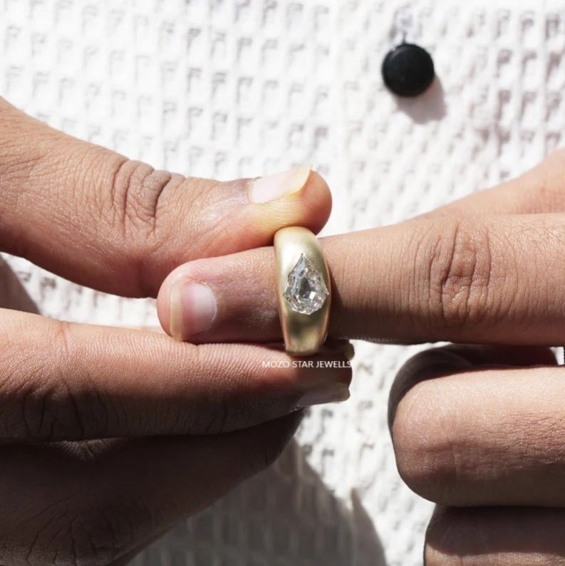 Solitaire Moissanite Ring A Perfect Choice For Your Special Occasion | This Elegant Ring Features A Step Cut Pear Moissanite That Sparkles Brilliantly In Its 14K Gold Setting | The Flush Set Moissanite Stones Add A Touch Of Modern Sophistication, Elevate Your Elegance With Moissanite by MOZO STAR JEWELLS.